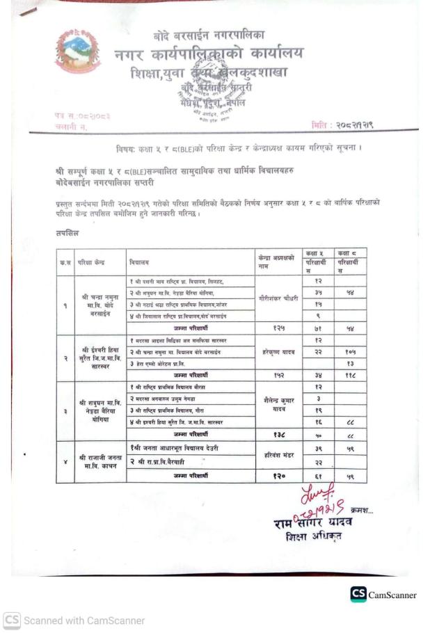 » कक्षा ५ र ८ (BLE)को परिक्षा केन्द्र र केन्द्राध्यक्ष कायम गरिईएको सूचना |||
