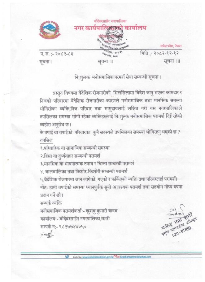निःशुल्क मनोसमाजिक परामर्श सेवा सम्बन्धि सूचना |||
