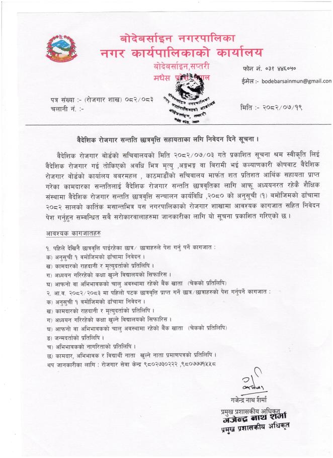 वैदेशिक रोजगार सन्तति छात्रवृृति सहायताका लागि निवेदन दिने सम्बन्धि सूचना |||