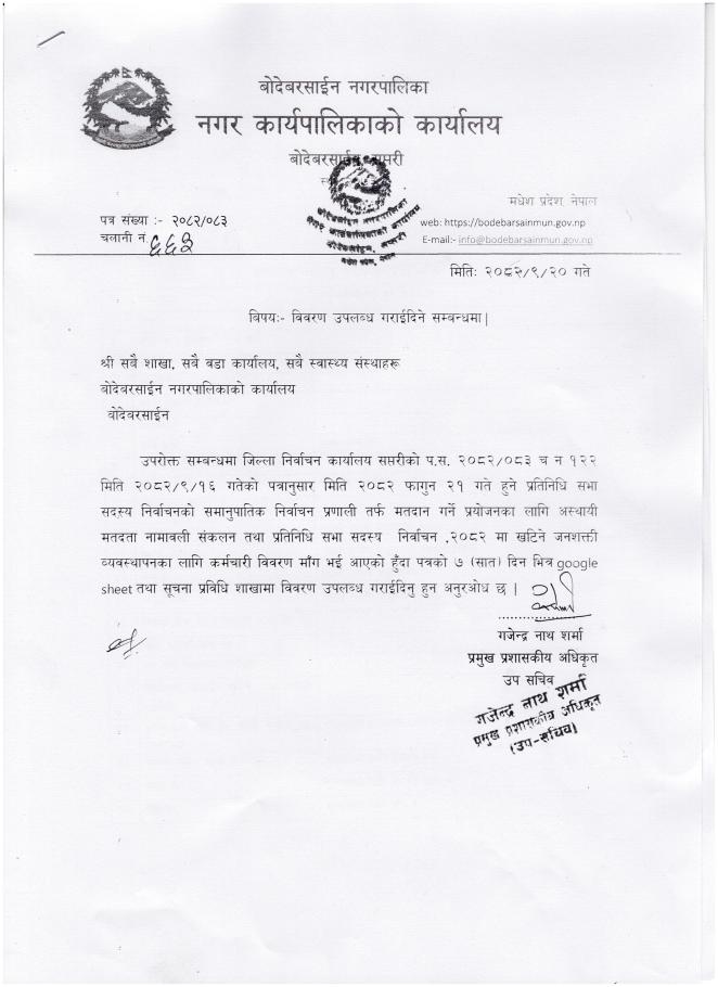 प्रतिनिधि सभा सदस्य निर्वाचन ,२०८२ मा खटिने जनशक्ती व्यवस्थापनका लागि कर्मचारी विवरण सम्बन्धिमा सूचना |||