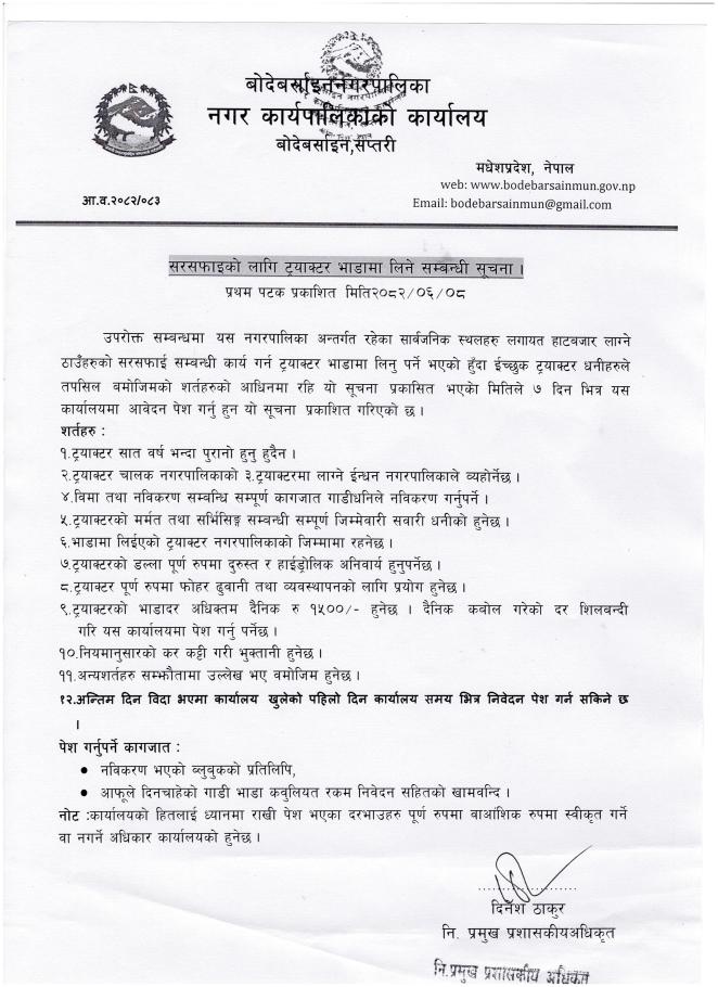 सरसफाईको लागि ट्रयाक्टर भाडामा लिने सम्बन्धि सूचना |||