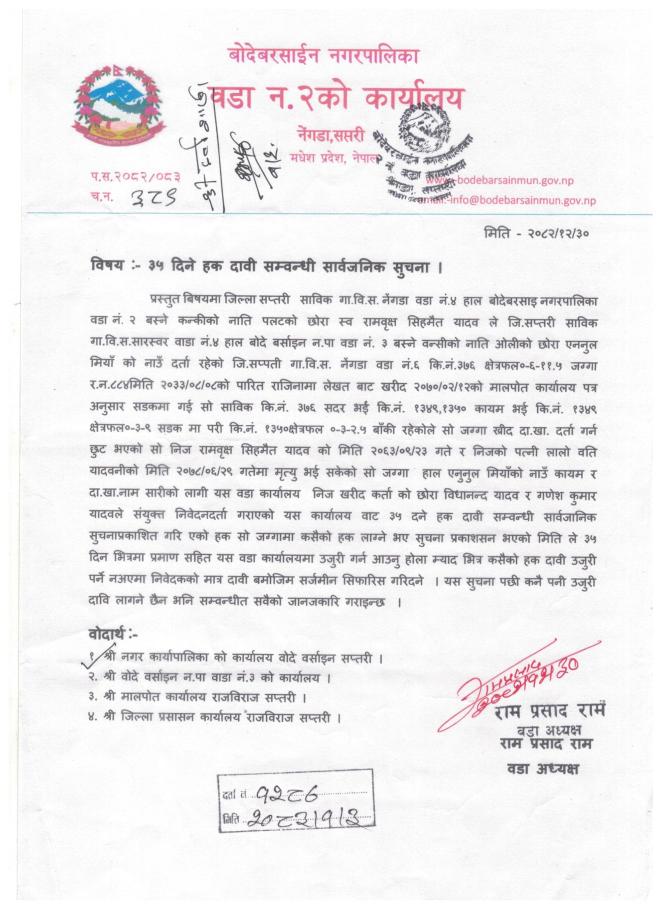 २ न वडा कार्यालयको ३५ दिने हक दावी सम्बन्धि सूचना |||